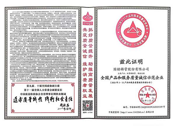 • 全國產品和服務質量誠信示范企業